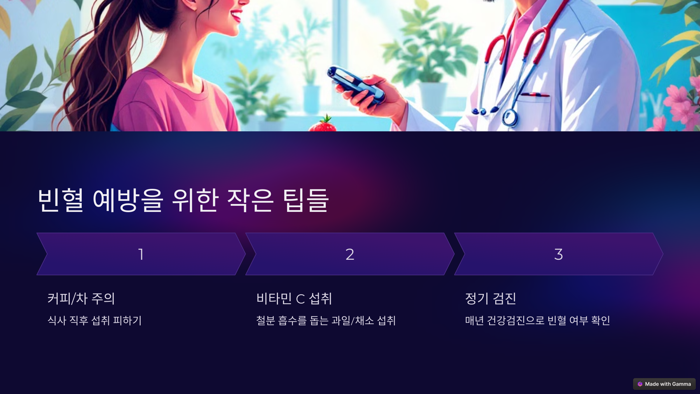 지금 당장 오늘의 식단을 점검하고, 빈혈 예방을 위한 첫걸음을 내딛어 보세요! 💪 여러분의 건강한 일상을 응원합니다. 😊
