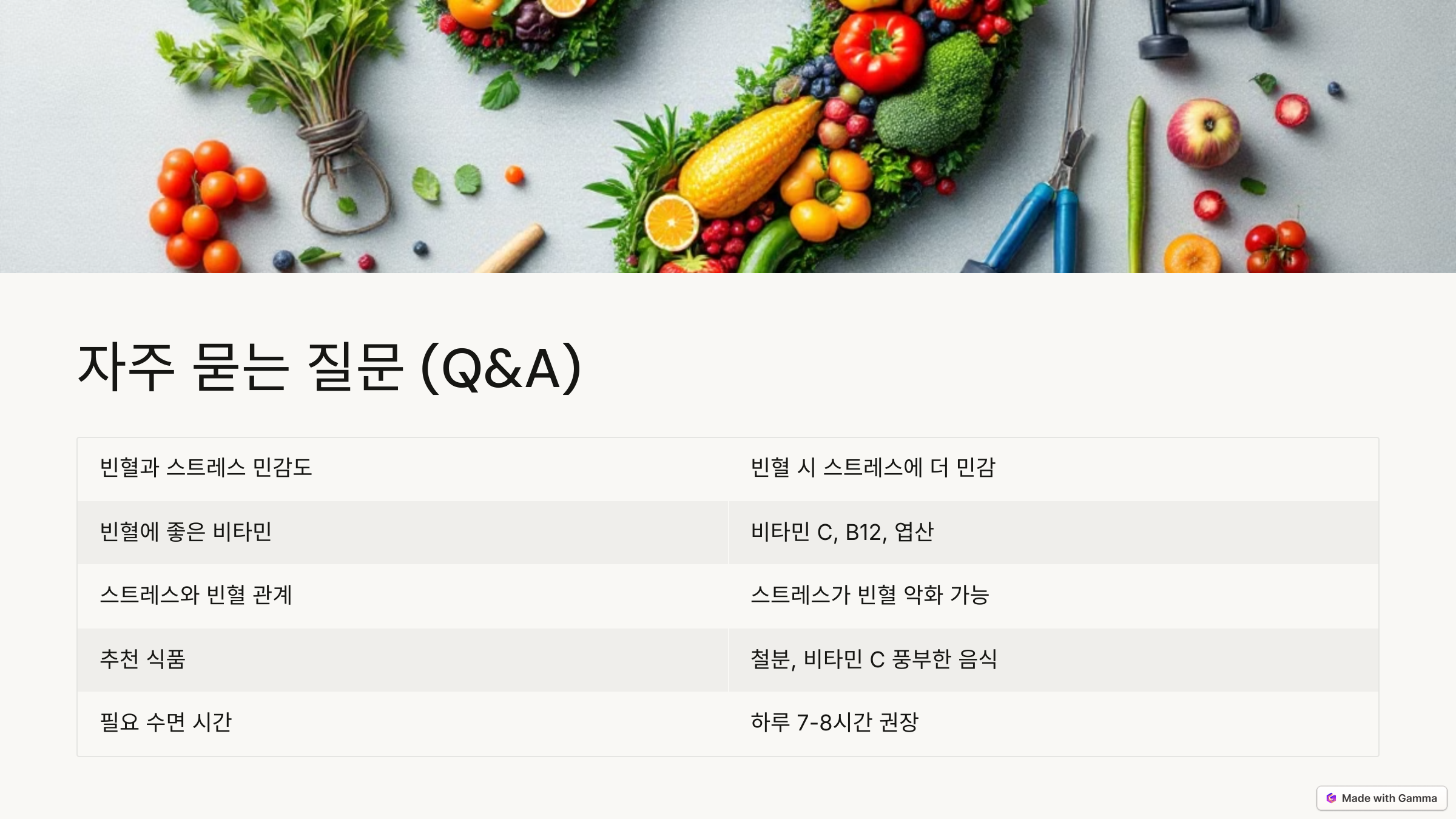 A1. 네, 빈혈이 있으면 피로와 에너지 저하로 인해 스트레스에 더 민감해질 수 있습니다. 특히 산소 공급이 원활하지 않아 정신적 피로를 쉽게 느낄 수 있습니다.