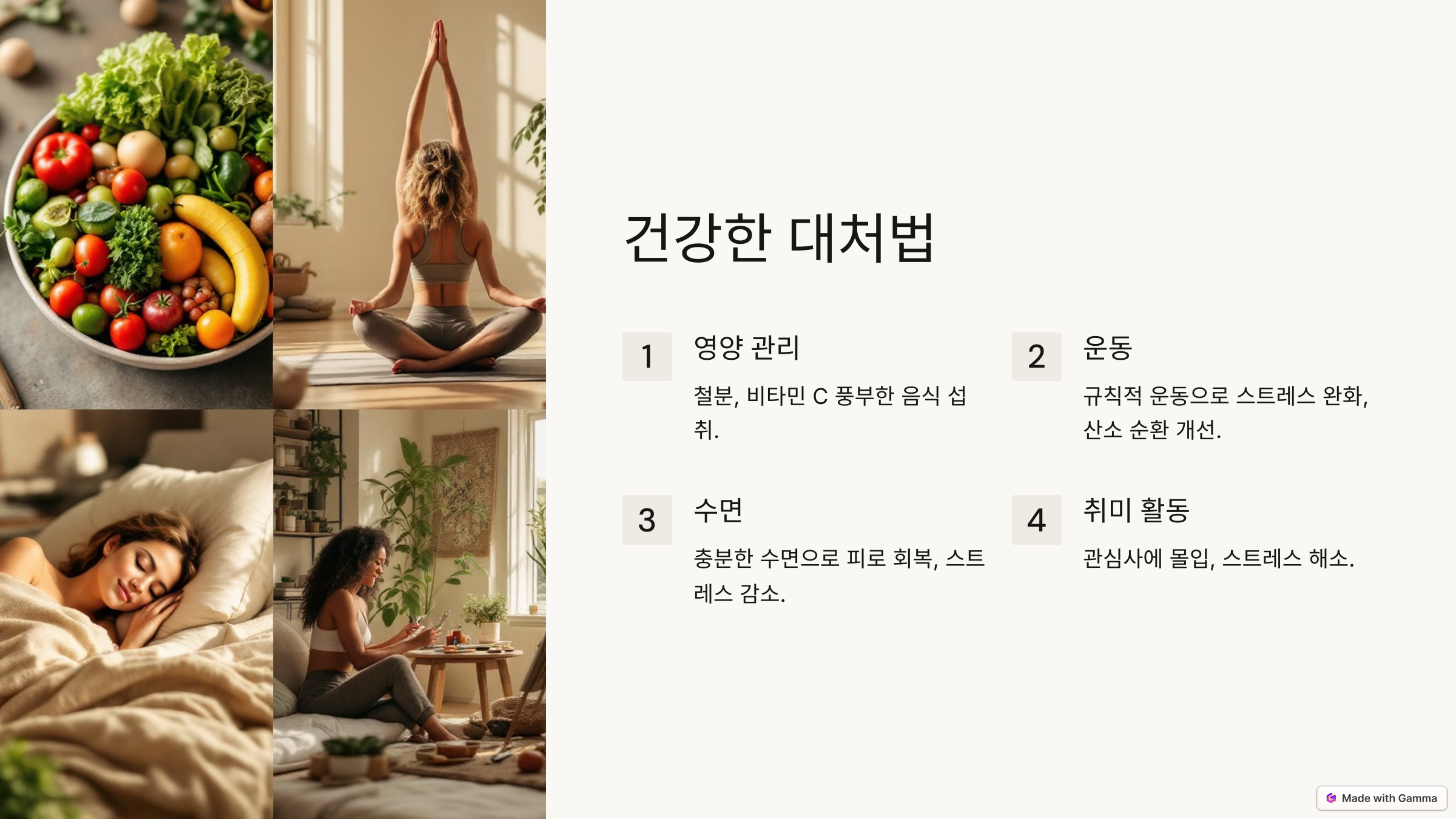 빈혈과 스트레스를 예방하고 완화하기 위해 건강한 생활 습관과 영양 관리가 필수적입니다. 아래에서 자세한 방법을 알아보겠습니다.