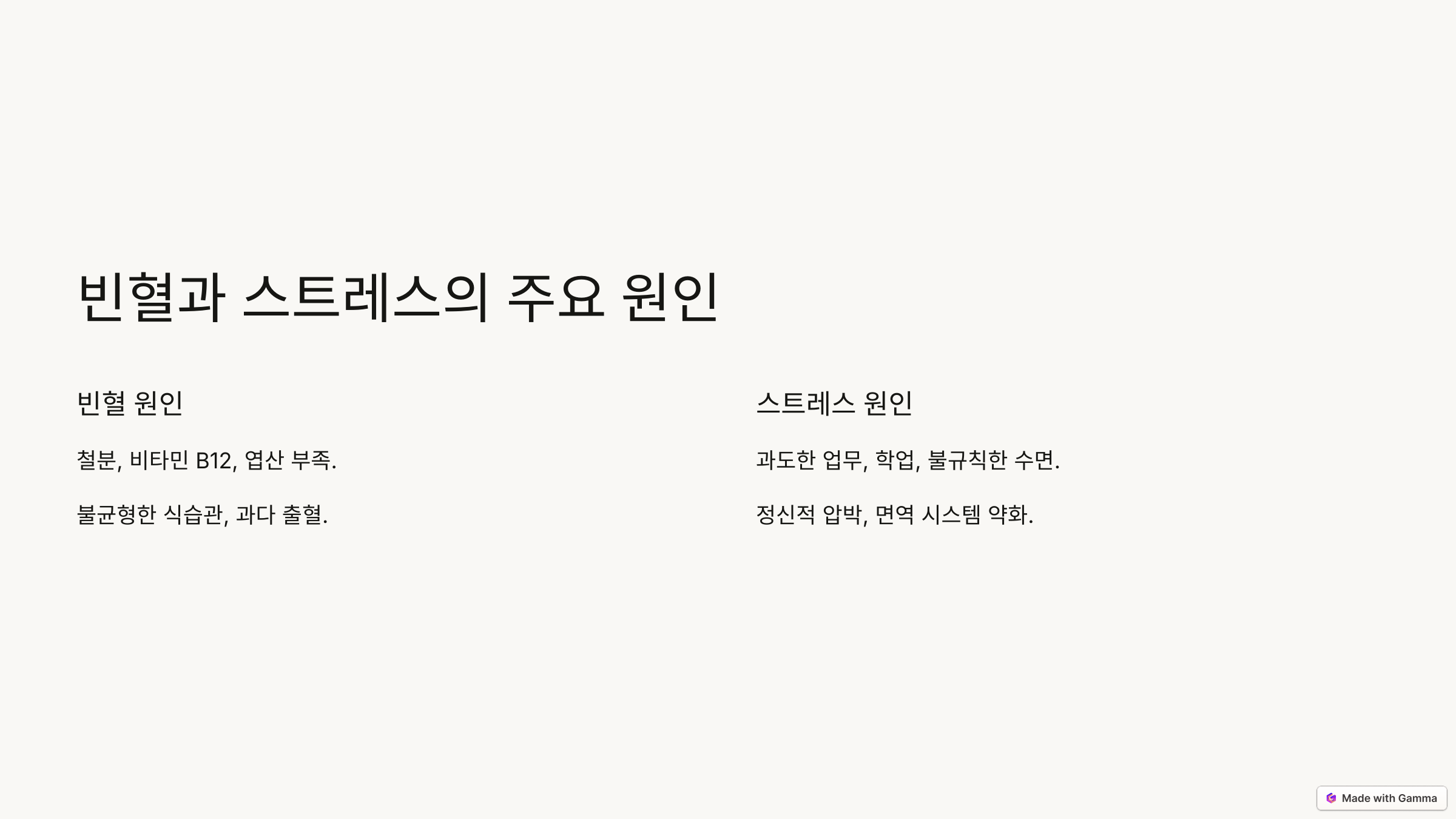 - 불규칙한 수면: 스트레스는 수면의 질을 저하시켜 피로 회복을 방해하고 빈혈 증상을 악화시킬 수 있습니다.