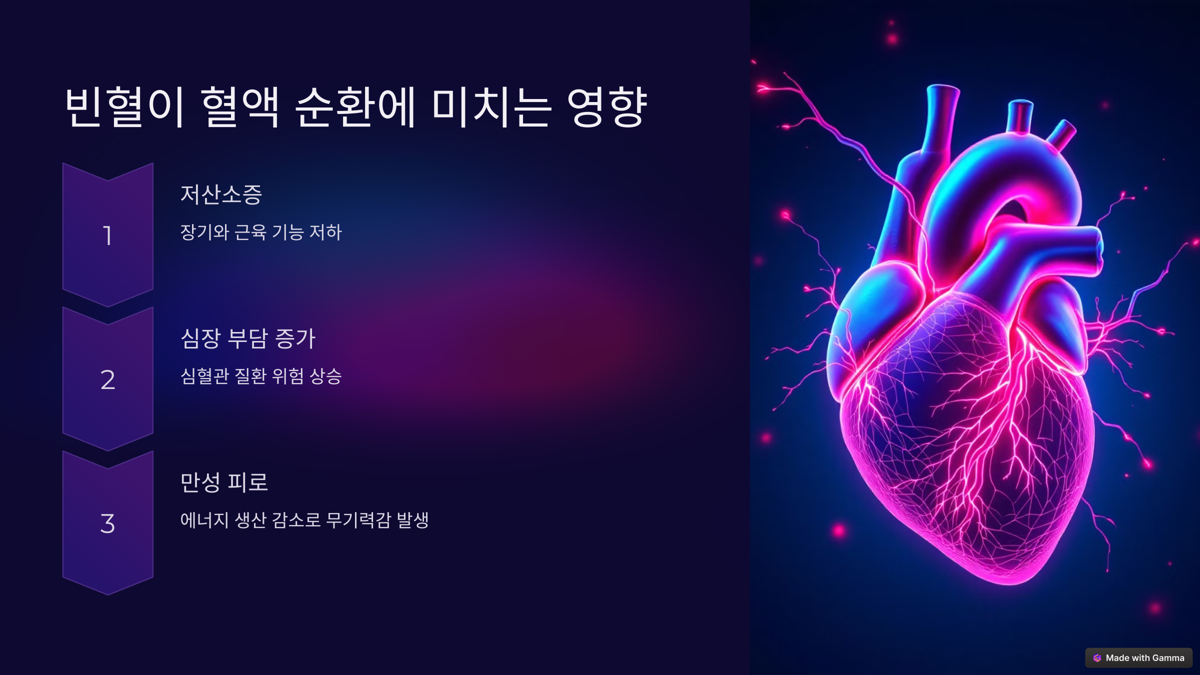 빈혈로 인해 산소 운반 능력이 감소하면 심장은 더 많은 혈액을 펌프질해야 합니다. 이는 심장에 과도한 부담을 줄 수 있어요. 장기적으로는 심부전과 같은 심혈관 질환의 위험을 높일 수 있습니다.