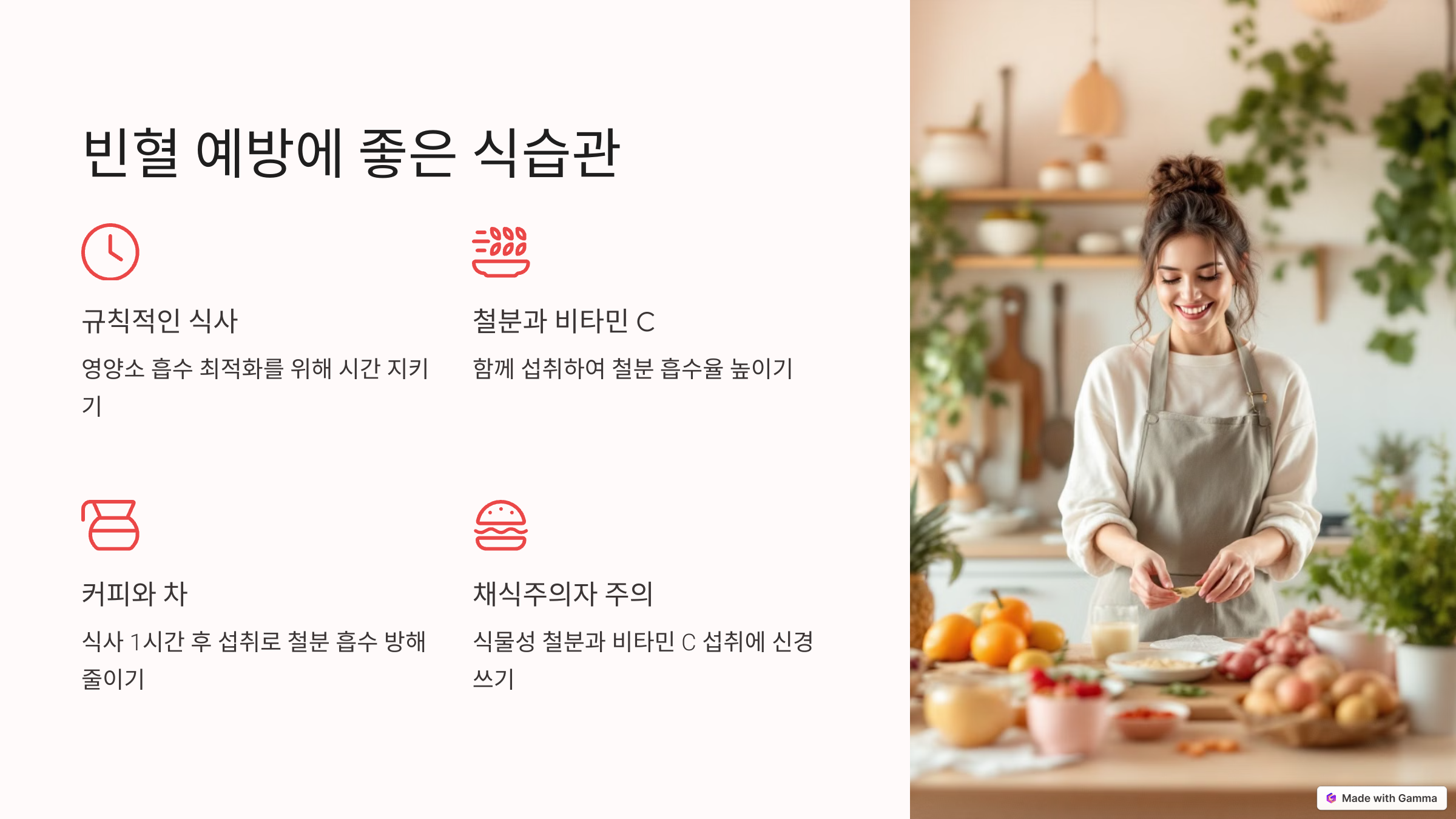 - 철분과 비타민 C가 함께 들어간 식사를 통해 철분의 흡수율을 높이기 위해 노력하세요.