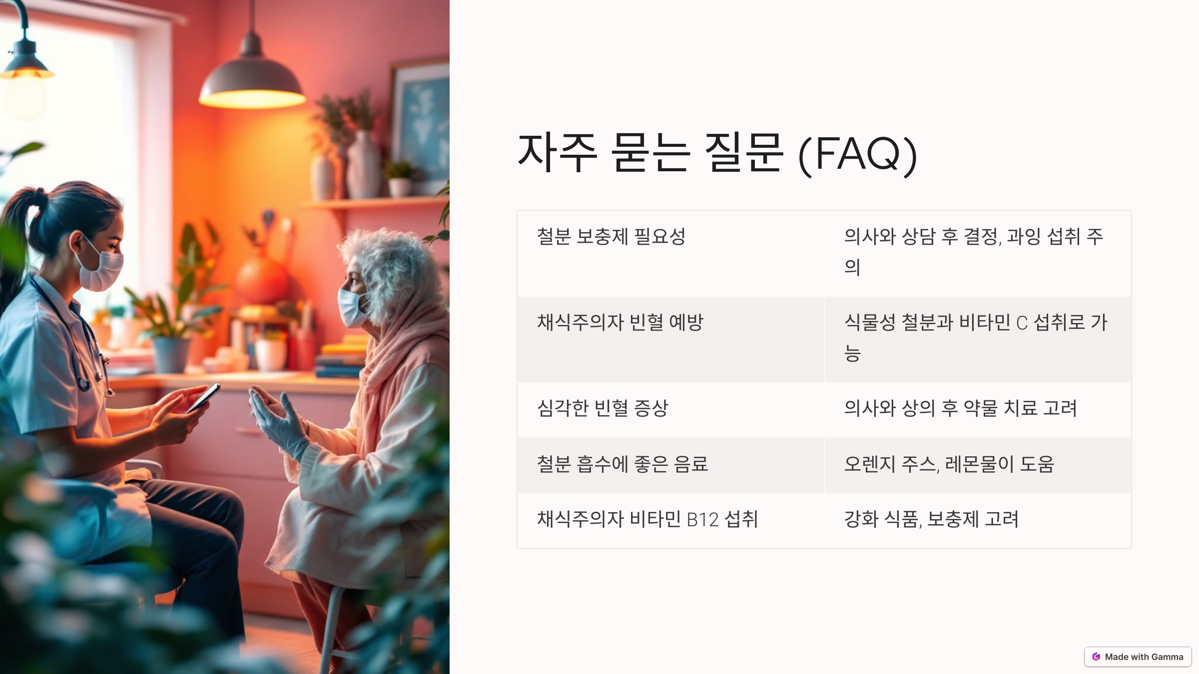 A1. 음식으로 충분한 철분을 섭취하기 어렵거나, 빈혈 증상이 지속될 경우 의사와 상담 후 보충제를 섭취할 수 있습니다. 다만, 철분 과잉 섭취는 오히려 부작용을 초래할 수 있으니 주의하세요.