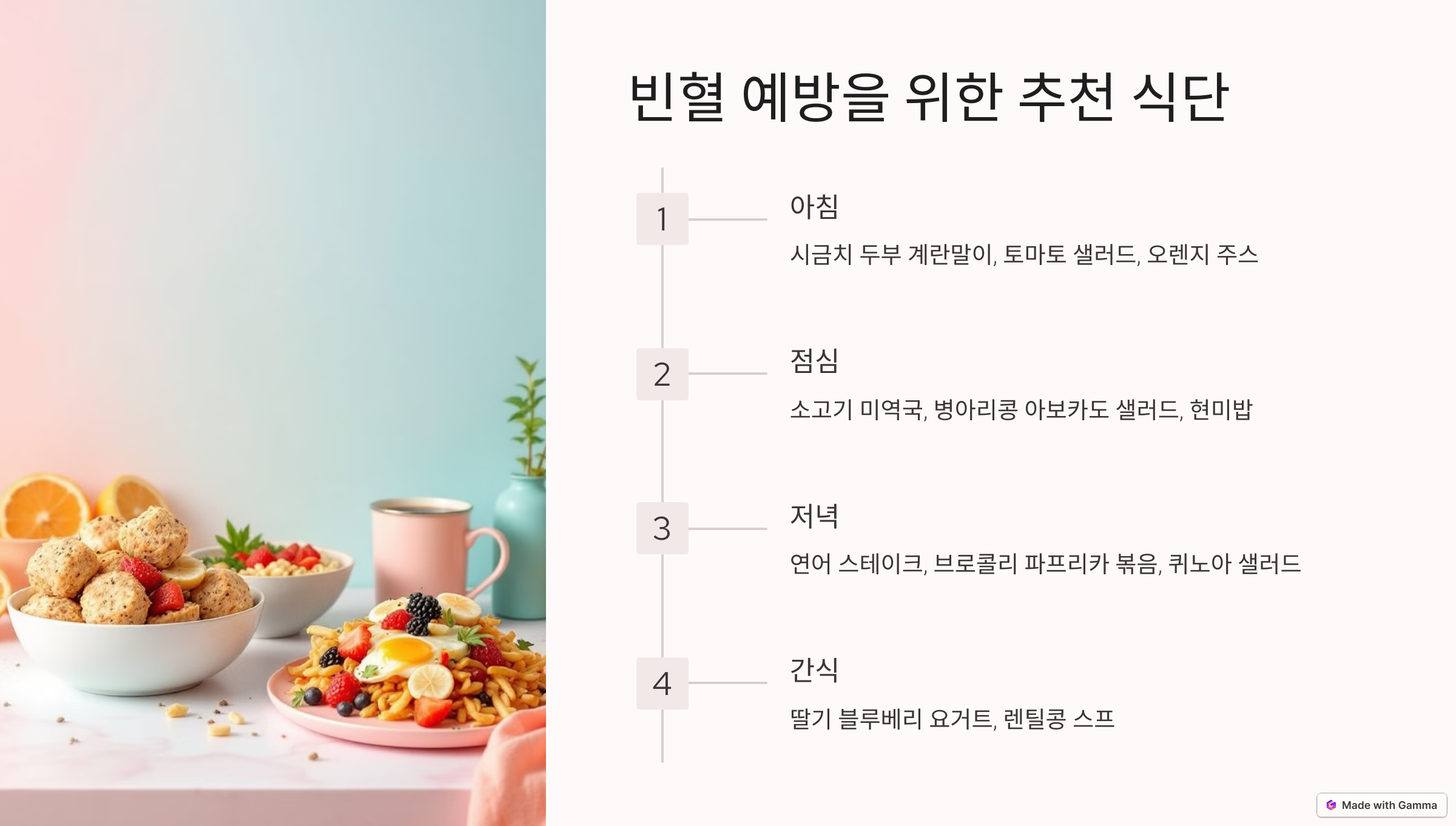 빈혈 예방을 위해 구성한 하루 식단입니다. 철분과 비타민이 풍부한 음식들을 포함하여 쉽고 간단하게 따라 할 수 있도록 설계했습니다.