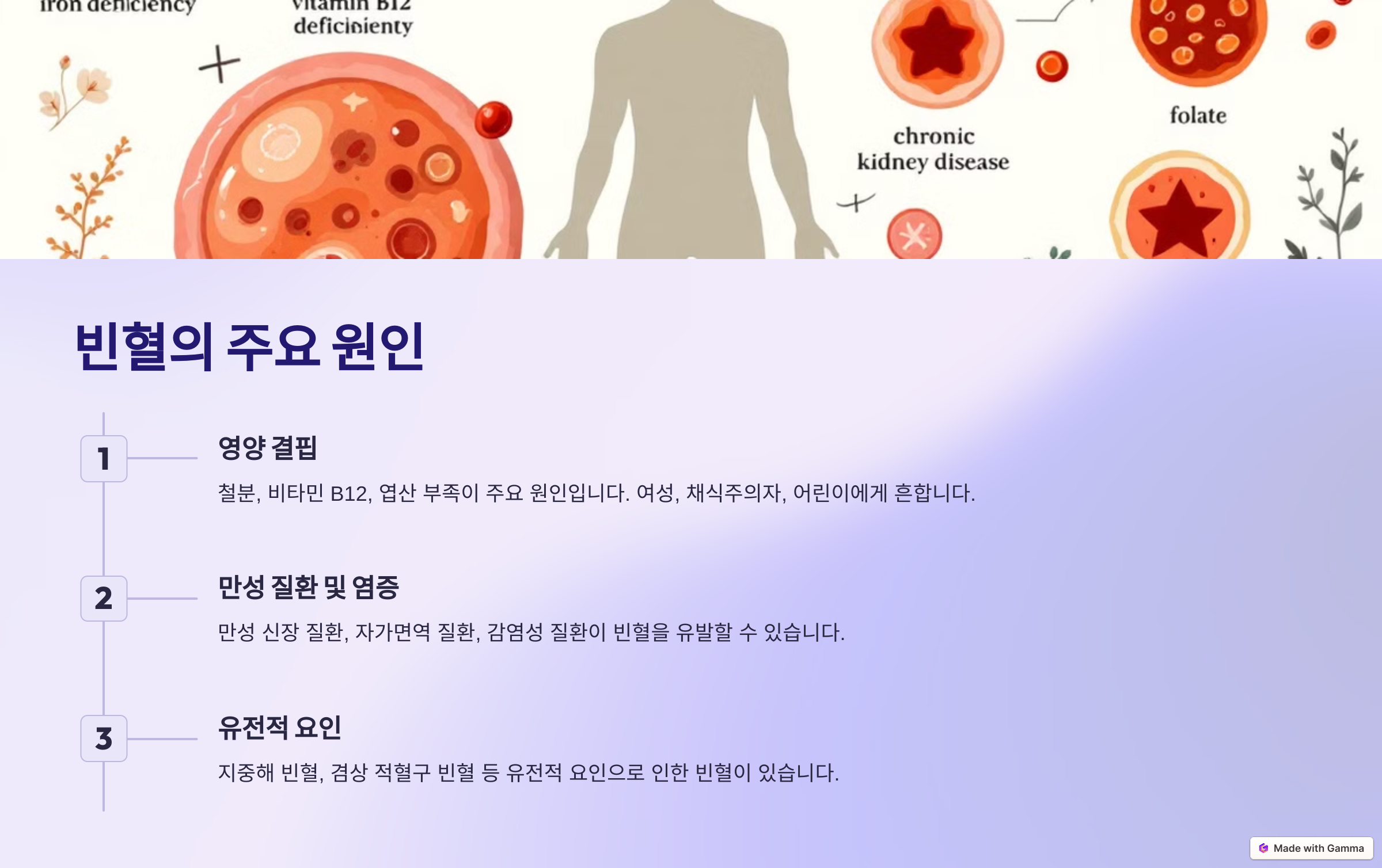 빈혈의 원인은 크게 영양 결핍, 만성 질환, 유전적 요인 등으로 나눌 수 있습니다. 각 원인에 따라 치료와 관리 방법이 다르기 때문에 원인을 정확히 파악하는 것이 중요합니다.