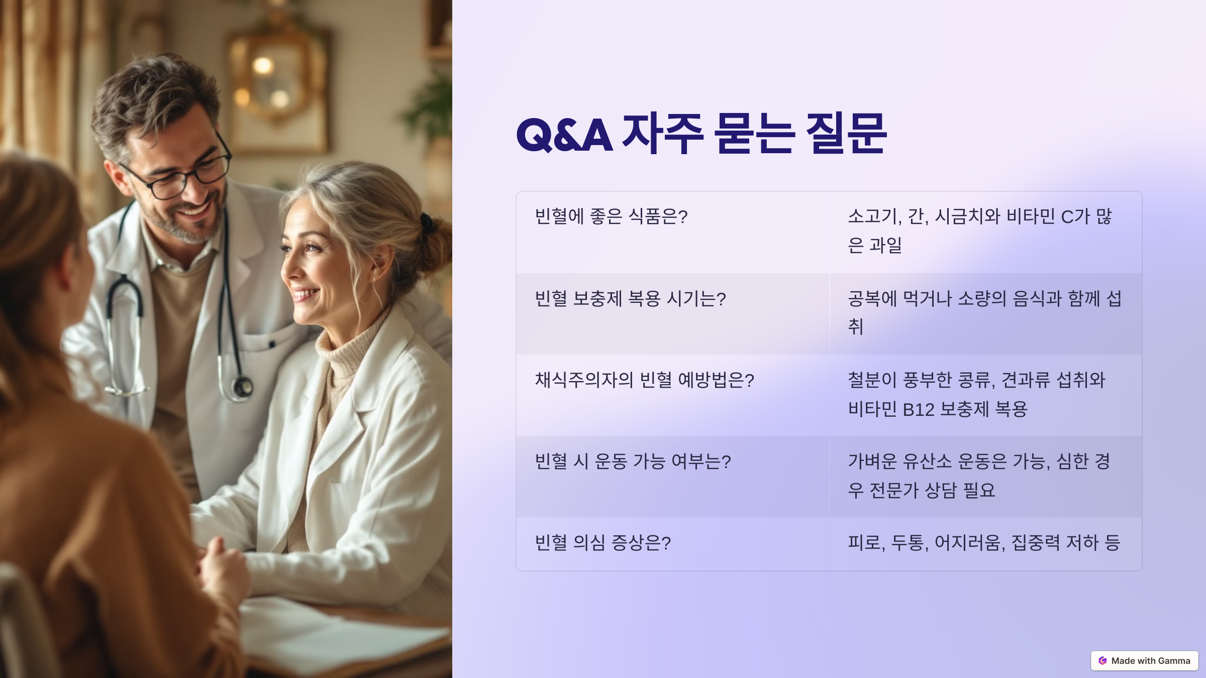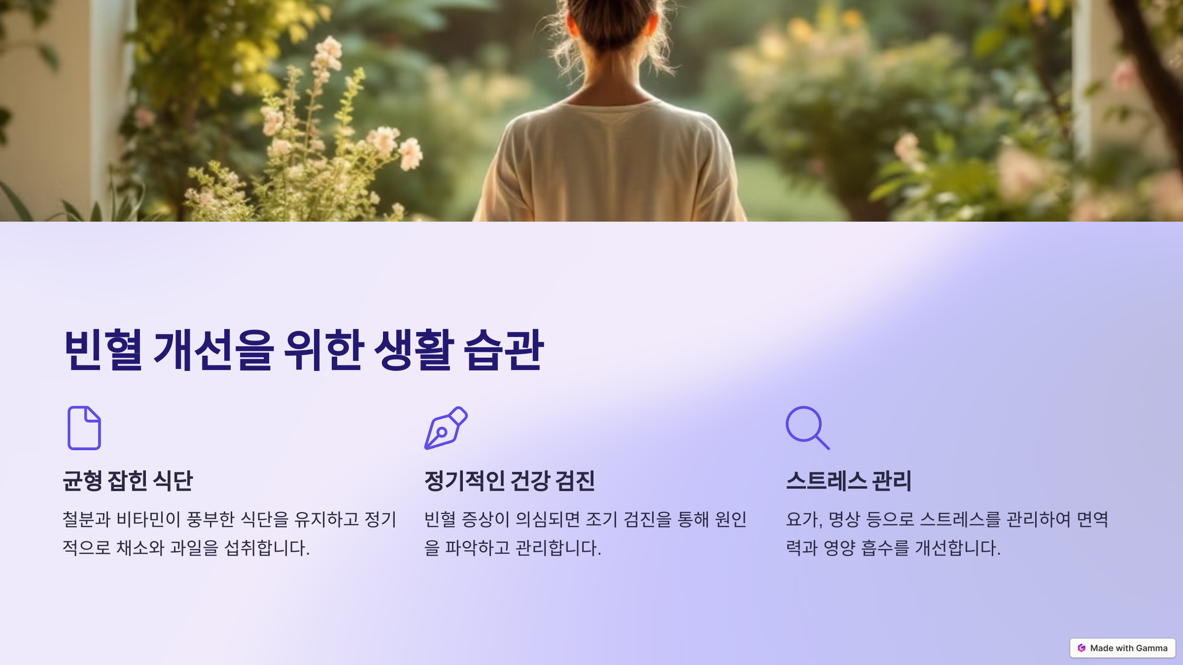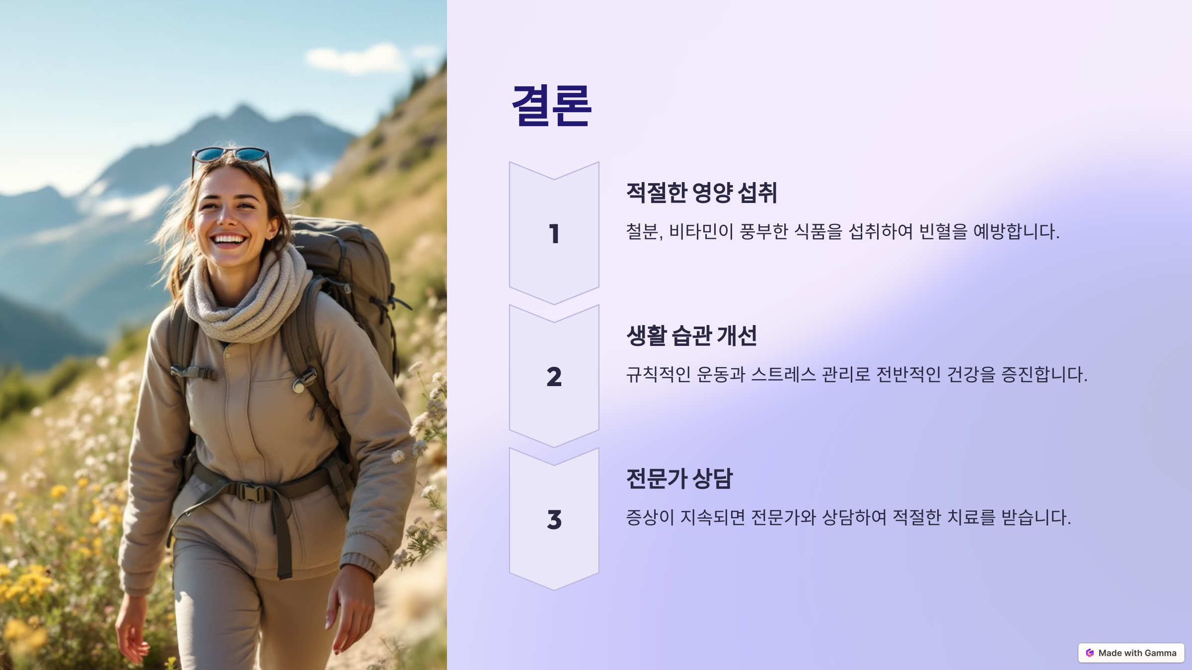 빈혈은 적절한 영양 섭취와 생활 습관 개선을 통해 충분히 관리할 수 있는 질환입니다. 증상이 지속되거나 심해질 경우 전문가와 상담하여 원인을 정확히 파악하고 적절한 치료를 받는 것이 중요합니다. 건강한 몸을 유지하기 위해 꾸준한 관리와 관심이 필요합니다. 지금부터라도 올바른 식습관과 생활 습관을 통해 빈혈을 예방하고, 활기찬 생활을 유지해 보세요!