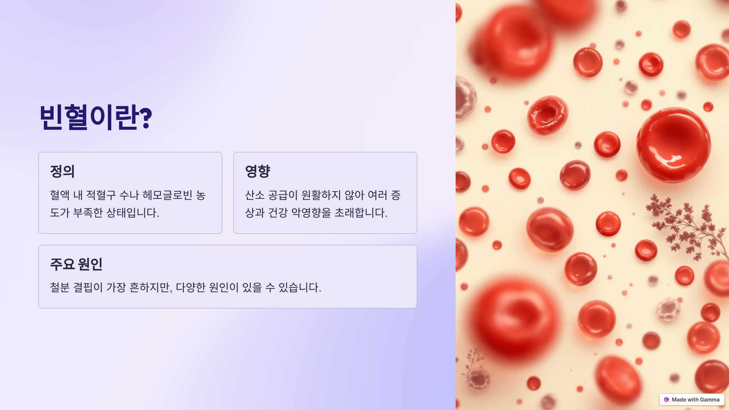 빈혈이란 혈액 내 적혈구 수나 헤모글로빈 농도가 부족하여 산소 공급이 원활하지 않은 상태를 말합니다. 적혈구는 신체 조직으로 산소를 운반하는 중요한 역할을 하므로, 빈혈 상태가 지속되면 여러 증상과 함께 건강에 악영향을 미칠 수 있습니다. 일반적으로 빈혈은 철분 결핍으로 인한 경우가 많지만, 그 외에도 다양한 원인이 있을 수 있습니다.