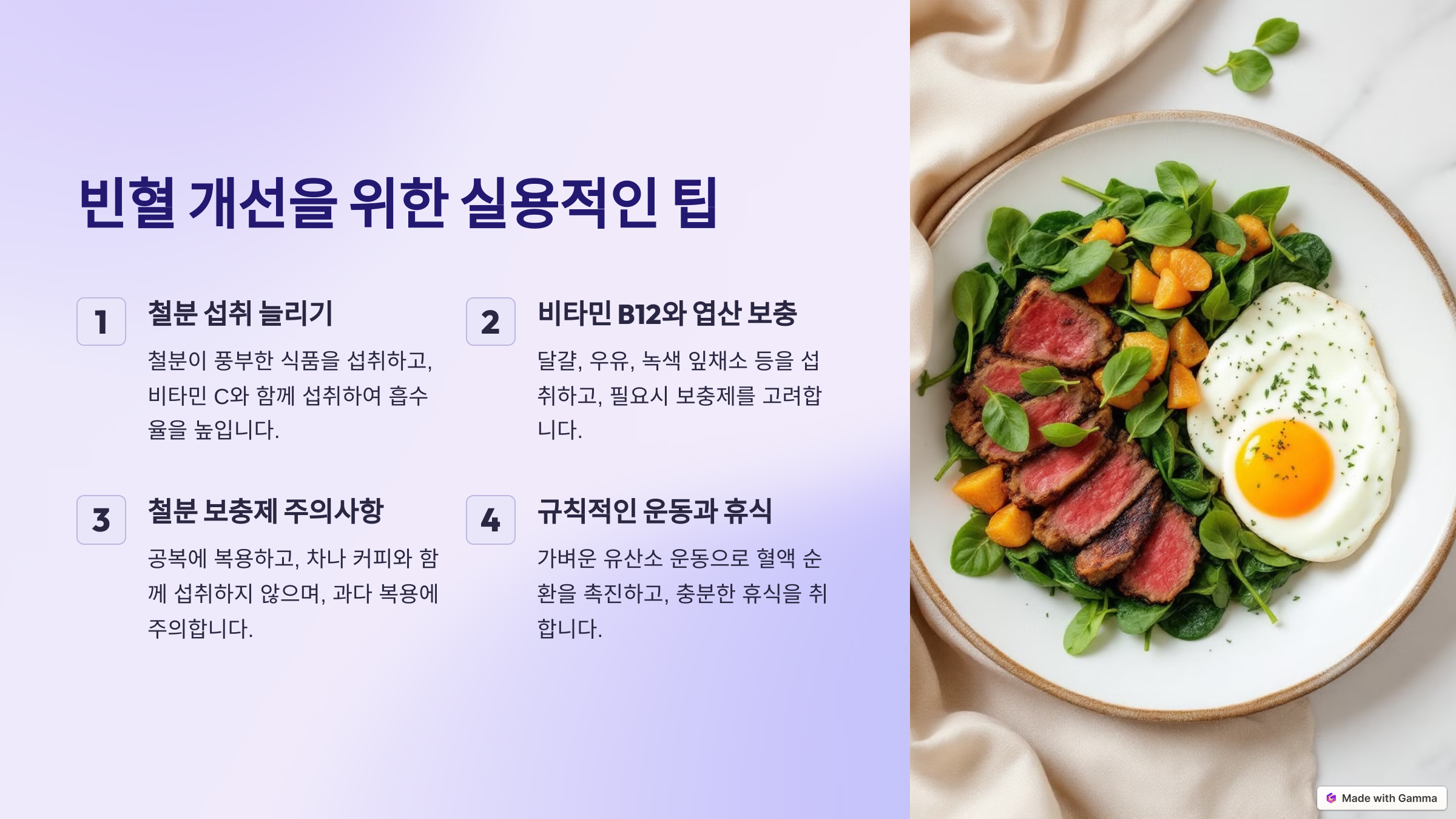 빈혈을 예방하고 개선하기 위해서는 꾸준한 생활 습관 관리가 필요합니다. 올바른 식습관과 규칙적인 운동, 스트레스 관리가 이를 돕습니다. 다음과 같은 생활 습관을 고려해 보세요.