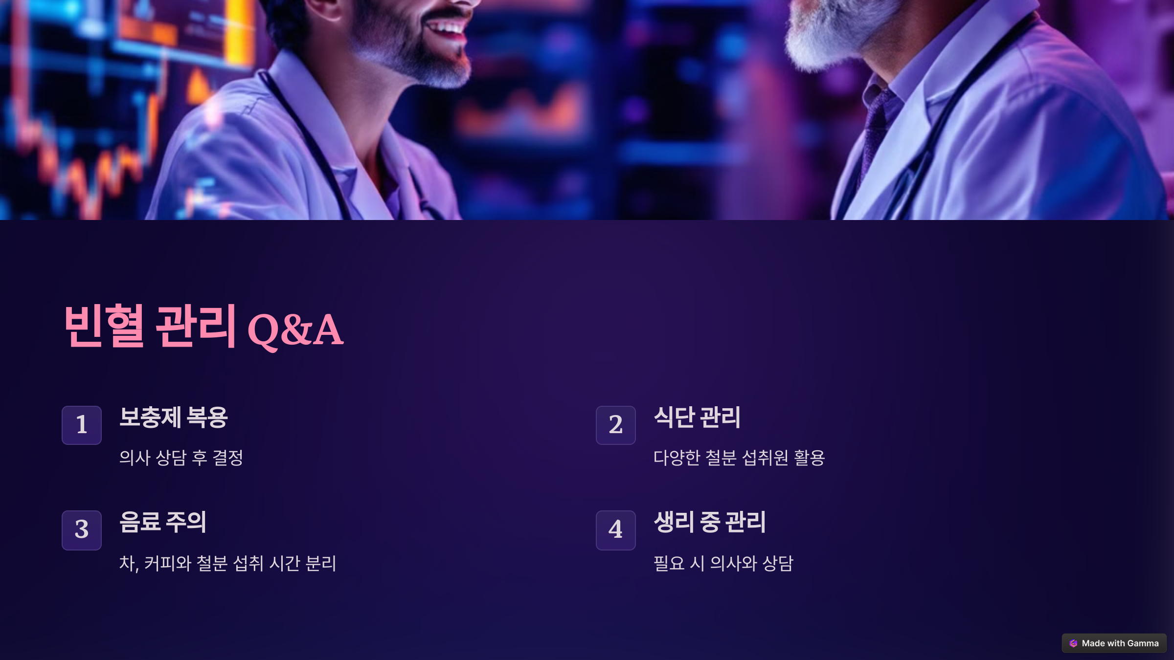 A1. 철분 보충제는 빈혈 증상이 있다고 무조건 복용하는 것이 아니라, 필요한 경우 의사의 상담을 통해 복용해야 합니다.