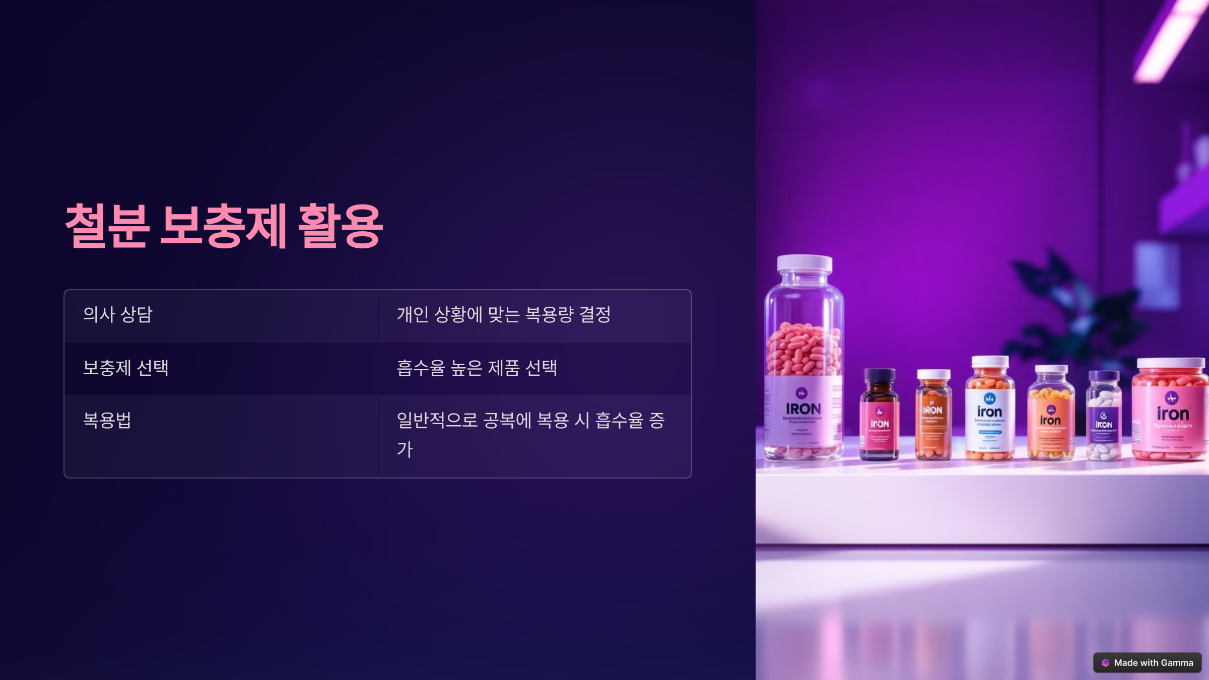 • 철분 보충제의 종류와 복용법: 철분 보충제는 흡수율이 높은 형태의 제품을 선택하는 것이 좋으며, 일반적으로 공복에 복용 시 흡수율이 높아집니다.