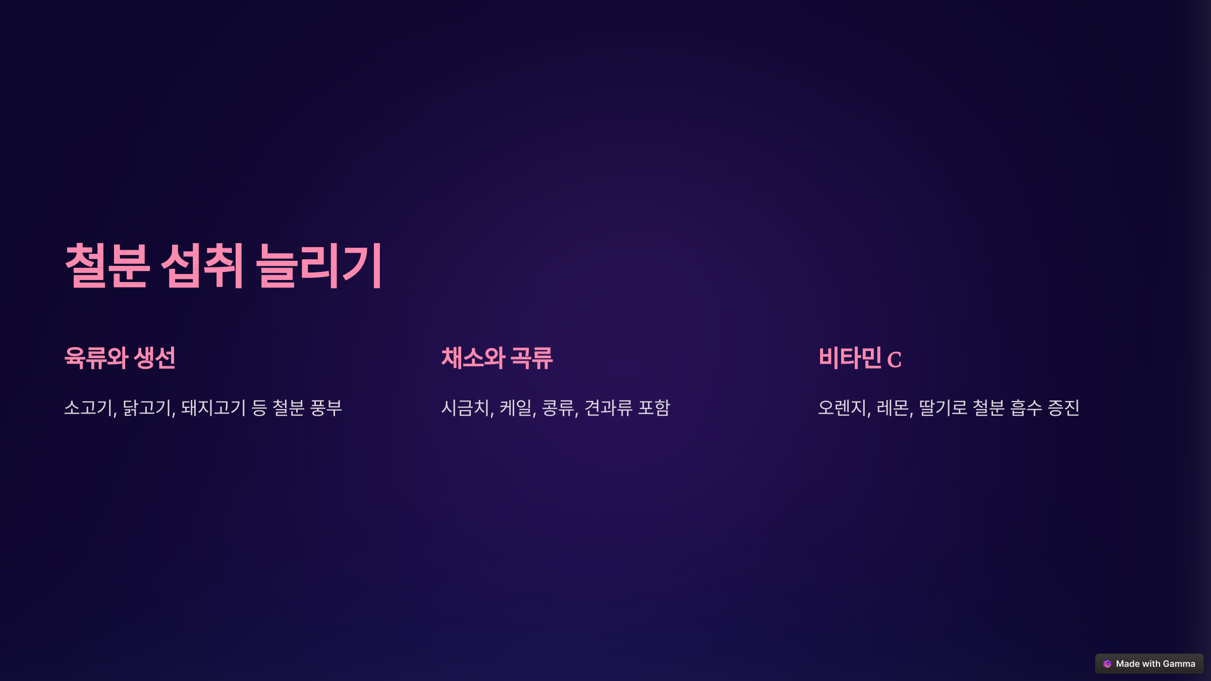 • 비타민 C와 함께 섭취하기: 철분 흡수를 돕는 비타민 C가 풍부한 과일(오렌지, 레몬, 딸기 등)과 철분이 풍부한 식품을 함께 먹으면 좋습니다.