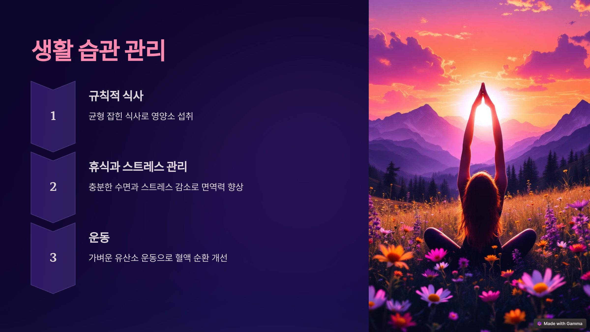 • 운동으로 순환 개선: 가벼운 유산소 운동은 혈액 순환을 원활하게 하고 체력도 향상시킵니다. 적절한 운동은 전반적인 건강에 큰 도움을 줄 수 있습니다.